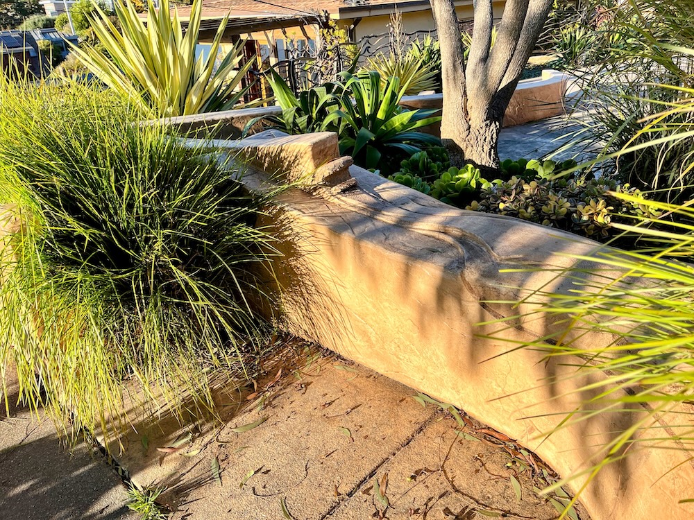 A wavy concrete structure at the wave gardenNevertheless, the garden itself is worth it! The aesthetically pleasing concrete curves were designed by artist, Victor Armador. The fencing and ironwork, equally artistic, are by the late blacksmith, Robert Sharpe. The gardener Kellee Adams filled the structure with waterwise plants.